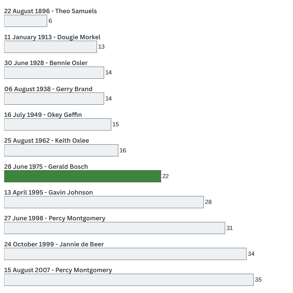 Since Gerald Bosch was my childhood hero, I was curious about the other great flyhalves that played for the Springboks. I racked my brain to try and devise a system that I could use to compare the likes of Hannes Brewis, Keith Oxlee, Piet Visagie and even Henry Honiball with Gerald Bosch. After many months spent doing this, I realised that finding criteria that may be applied equally to players from different eras is nearly impossible. The most apparent criterion, namely the number of test matches played, was a non-starter due to the vast difference in the number of tests played in the amateur and professional eras. It became clear that trying to compare players from different eras is futile.