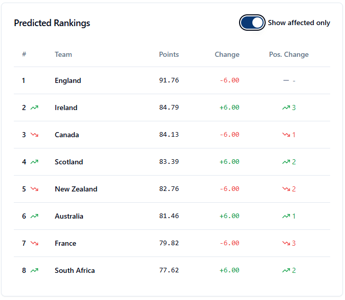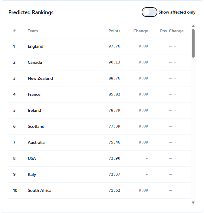 A crucial point is that these potential ranking changes have been discussed in isolation, without considering how results in other matches could affect the final rankings at the end of the weekend. There is a crazy, parallel universe where all the lower-ranked teams win by more than 15 points, resulting in the World Rankings looking like this: