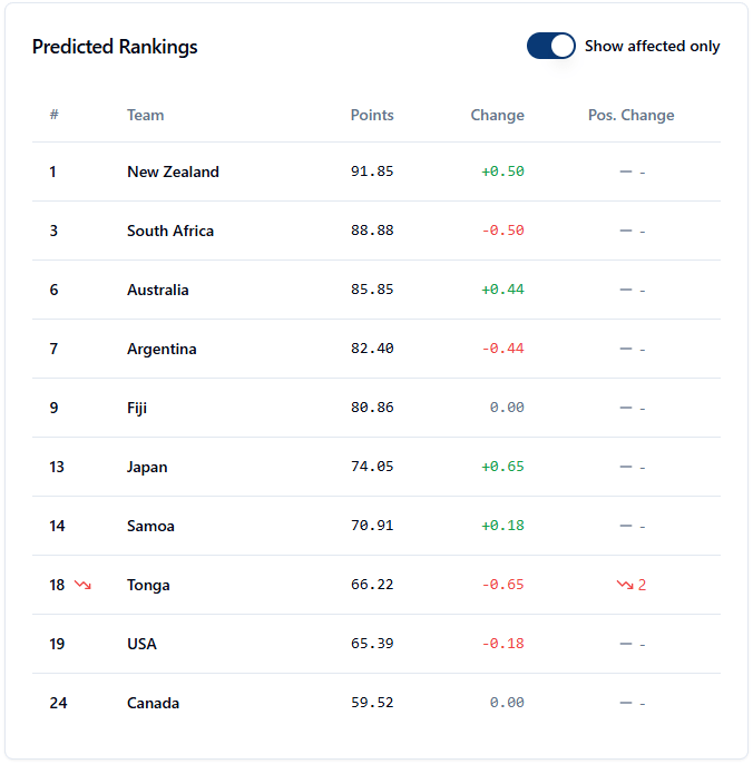 As Tonga have been designated as the home team, any victory for them would not result in as big a swing in points as it might have had they been deemed the away side. Nevertheless, should they win by more than 15 points, they would gain +2.03 points, a healthy return but not enough to move them higher in the rankings. Japan, however, would jump up one spot and above Wales if they won by more than 15 points, gaining 0.97 points, while Tonga would slip two spots to 18th.