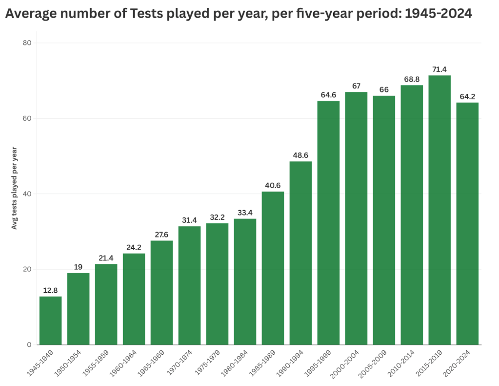 The key factor to keep in mind is the amount of rugby played in the years following the Second World War. The number of Tests played by the 10 countries which are today regarded as the Tier One rugby-playing nations has been steadily increasing since 1945. The following graph shows the increase in the average number of Tests played per year in five-year periods, starting from 1945: