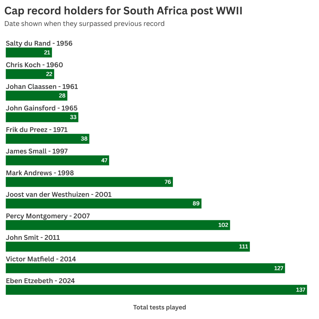 In the case of South Africa then the achievements of Salty du Rand, Chris Koch, Johan Claassen, John Gainsford, Jannie Engelbrecht, Frik du Preez and Jan Ellis must be viewed in the same light as the great achievements of their successors James Small (47 Tests), Mark Andrews (77), Joost van der Westhuizen (89), Percy Montgomery (102), John Smit (111), Victor Matfield (127) and Eben Etzebeth (136). The record of most Tests played for South Africa will continue to climb as the years roll by, but the feats achieved by those in the amateur era of the game should always be remembered and celebrated in the years to come.