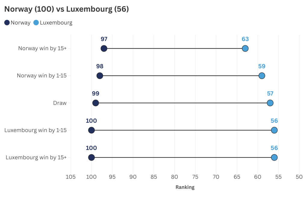 Norway and Luxembourg start their Rugby Europe Conference campaigns this weekend, with a large gap in the rankings making this a classic David vs Goliath clash. The men from Luxembourg are ranked 44 places above their opponents, and are eyeing a strong run in this year’s competition as they aim to return to the Rugby Europe Trophy after enduring relegation last season. Norway will go into the match knowing a victory would be a big upset, and will look to get some miles into their legs before they play against opponents closer to them in rankings. They will aim to improve on last year’s Rugby Europe Conference performance, when they only won one match, against Estonia. The last time these teams met, in 2018, it was a relatively close affair, with Luxembourg, ranked 63rd at the time, emerging as 35-16 victors. The Norwegians will have nothing to lose in this match: a win or draw will see them climb the rankings, while a loss will have no bearing on their position or ranking points. An unlikely runaway win for Norway would see them climb to 97th, while a close one would bump them up two places to 98th. A draw would see them rise to 99th. For Luxembourg, a big loss would be disastrous, seeing them slip from 56th to 63rd. A small loss would only see them fall to 59th, while a draw would result in them dropping one place to 57th. For a team looking to bounce straight back up to the Rugby Europe Trophy, this is a must-win as they look to beat the bigger fish in their pool later in the tournament.